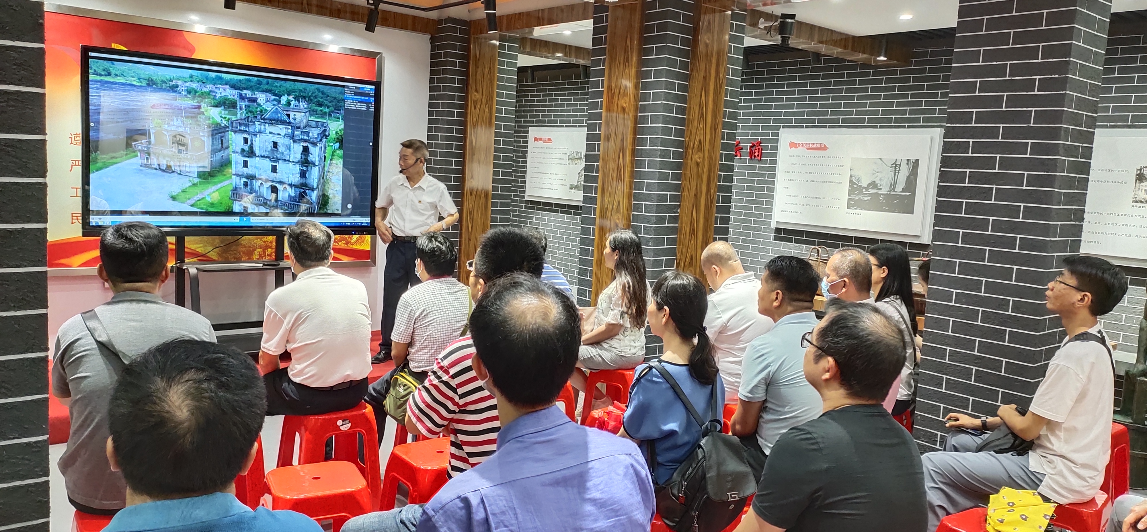 第三站走进江门市中共党史教育基地—张怀楼它是广东人民抗日解放军和云乡抗日自卫队与国民党顽军作战的战场之一,经历过战火的洗礼,楼内陈列的图片和文字资料,静静讲述着那段峥嵘岁月。大家认真地聆听烽火岁月的革命故事,感受战士们的英勇事迹,默默延续着红色革命精神。
